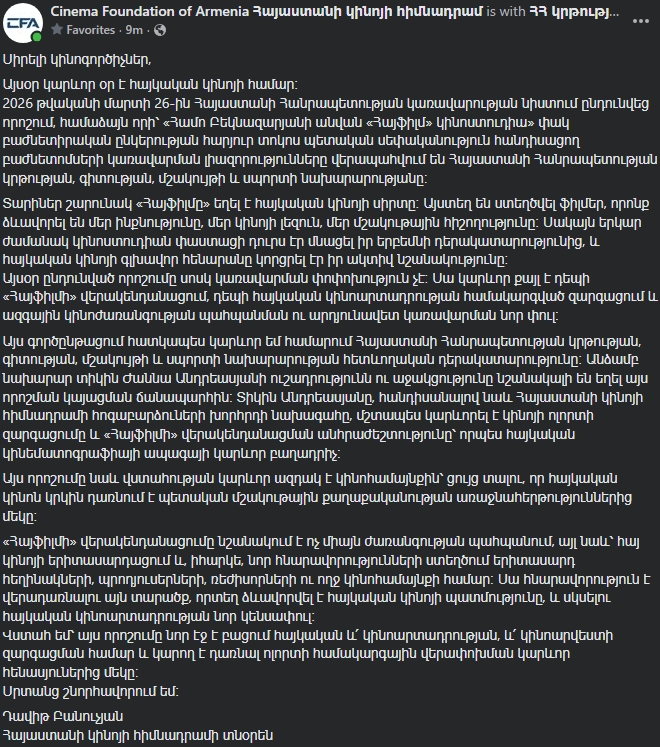 Հայաստանի կինոյի հիմնադրամի ուղերձը